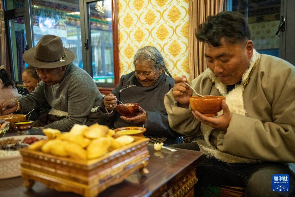 在位于西藏拉薩市當雄縣公塘鄉(xiāng)甲根村的家中,斯曲旺姆(右二)和家人在吃“古突”(2月8日攝)。新華社記者 孫瑞博 攝 ??
