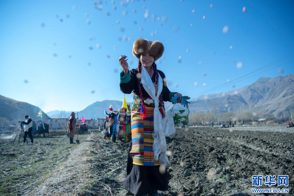 3月16日,克松社區(qū)居民在參加春耕儀式,播撒種子。新華網(wǎng) 旦增努布 攝 ??
