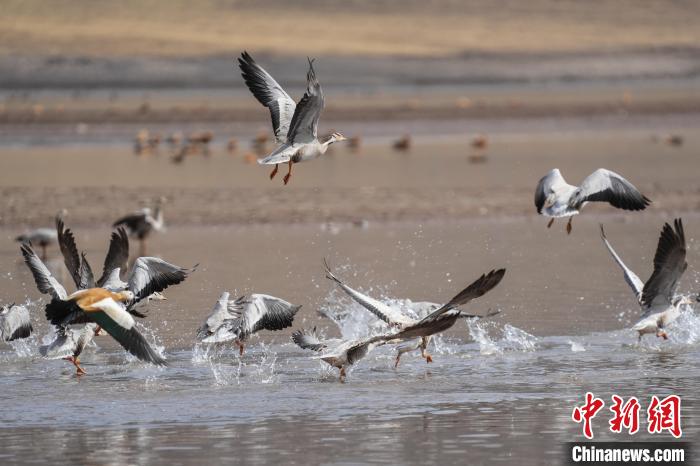 圖為斑頭雁、赤麻鴨在林周縣虎頭山水庫(kù)嬉戲。貢嘎來松 攝