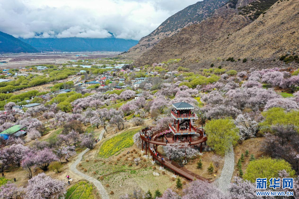 3月31日,林芝市巴宜區(qū)嘎拉村盛開的桃花(無(wú)人機(jī)圖片)。新華網(wǎng)發(fā) 李騰 攝