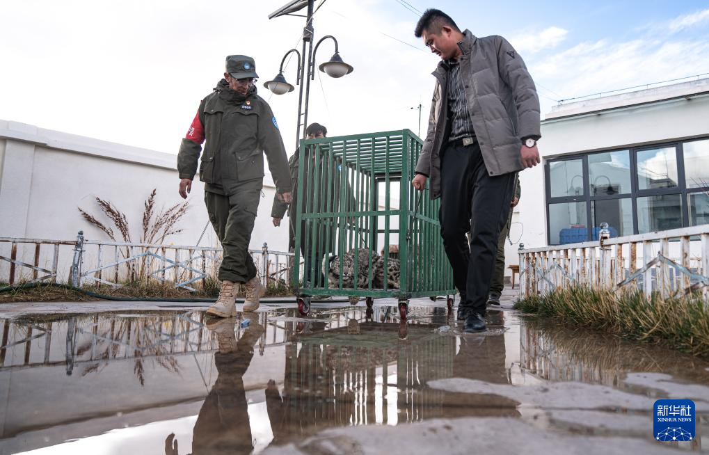 尼瑪縣野生動(dòng)物管護(hù)隊(duì)員在運(yùn)送即將放歸自然的雪豹(5月13日攝)。新華社記者 丁增尼達(dá) 攝
