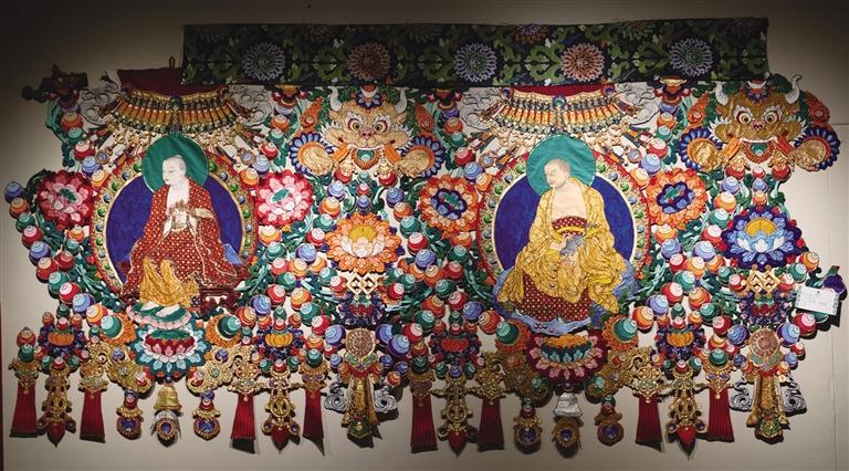 堆繡唐卡距今已有600多年的歷史,是藏民族特有的民間手工和繪畫技法相結(jié)合的造型藝術(shù),包括刺繡、馬尾繡、堆貼、鑲嵌等技藝,材料以綢緞、珠寶、金銀線等為主,精選各色圖紋錦緞組合構(gòu)成,頗具立體感。