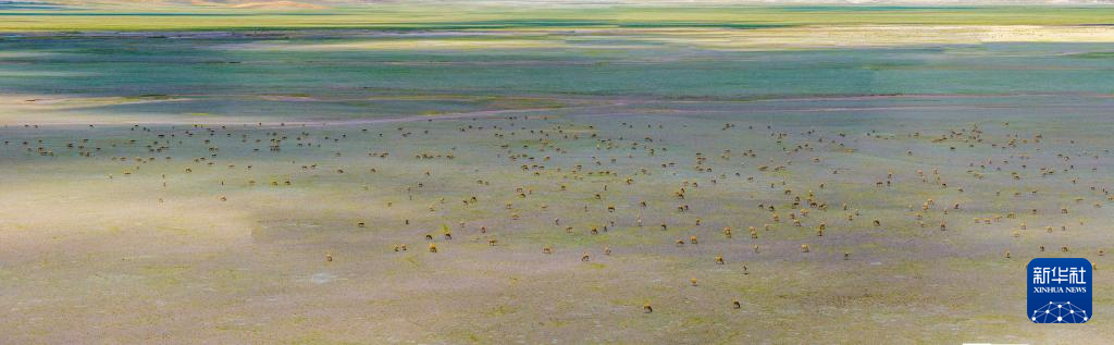 藏羚羊在魯確塘草原集結(jié)(無人機照片,6月8日攝)。新華社記者 姜帆 攝