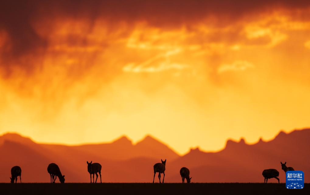 晚霞中魯確塘草原上待產(chǎn)的藏羚羊(6月16日攝)。新華社記者 費茂華 攝