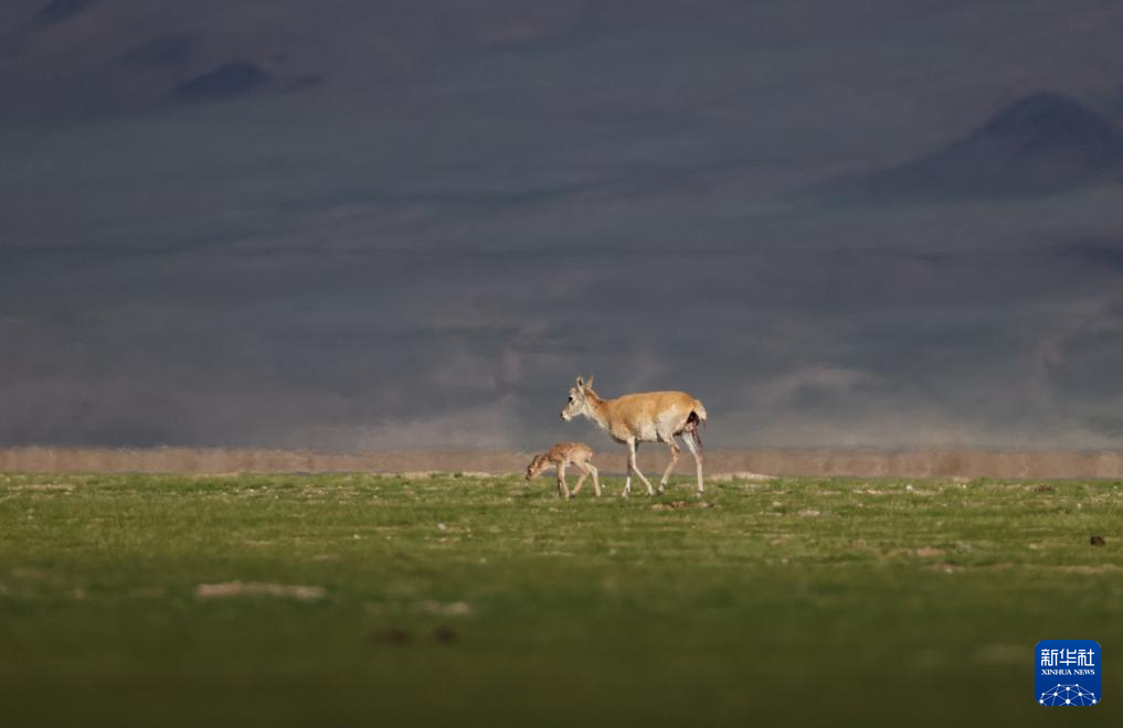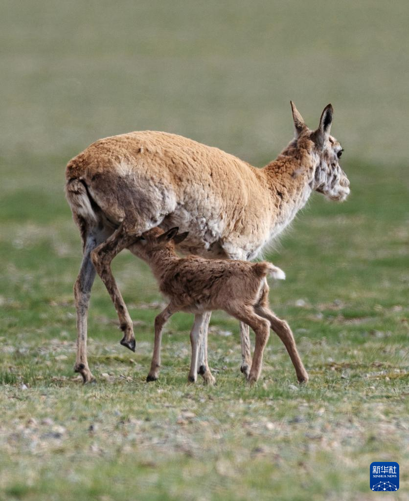 6月17日,在魯確塘草原,一只剛出生不久的小藏羚羊跟著母藏羚羊在草原上漫步。新華社記者 費茂華 攝