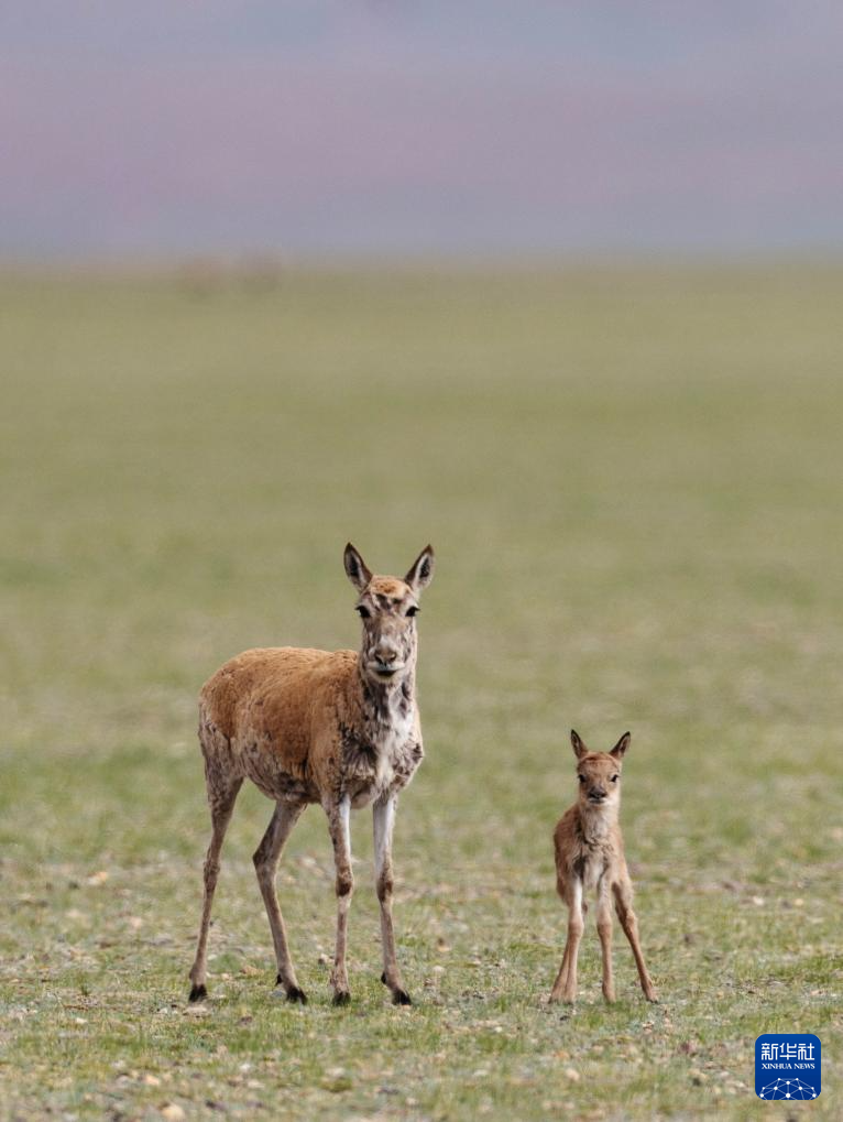 魯確塘草原上,藏羚羊媽媽守護著剛出生的小藏羚羊(6月16日攝)。新華社記者 旦增尼瑪曲珠 攝