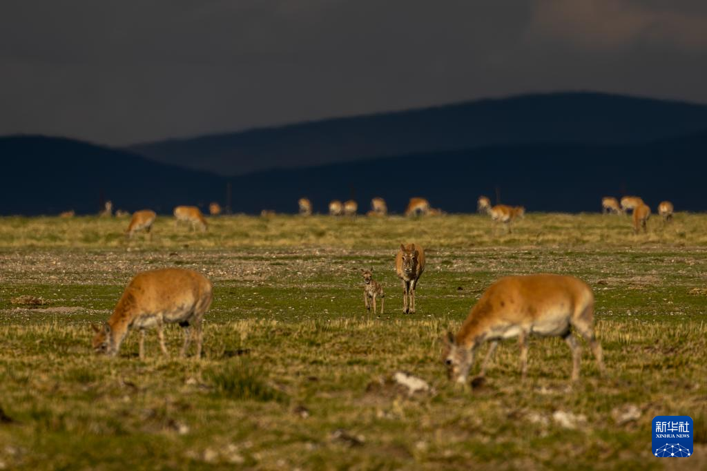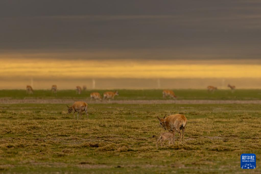 夕陽下,母藏羚羊在魯確塘草原上活動(6月16日攝)。新華社記者 晉美多吉 攝