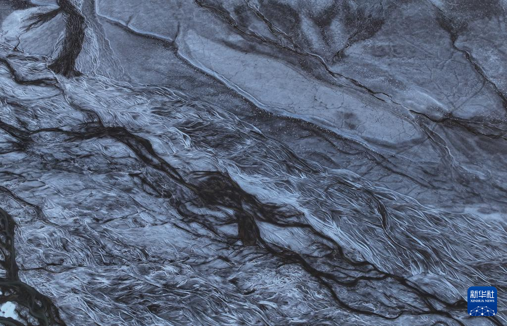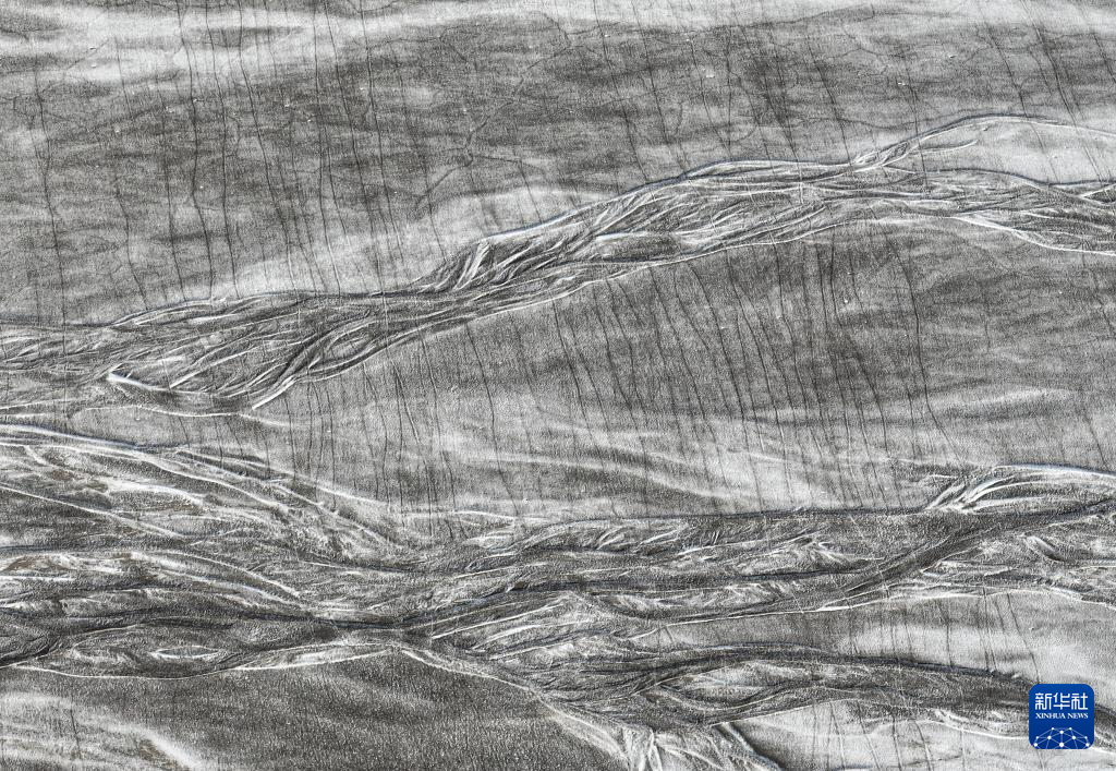 藏羚羊排隊走過甜水河河床,留下整齊的印跡(6月15日攝,無人機照片)。新華社記者 晉美多吉 攝
