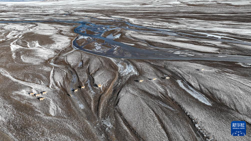 空中俯瞰藏羚羊排隊穿過甜水河(6月15日攝,無人機照片)。新華社記者 晉美多吉 攝