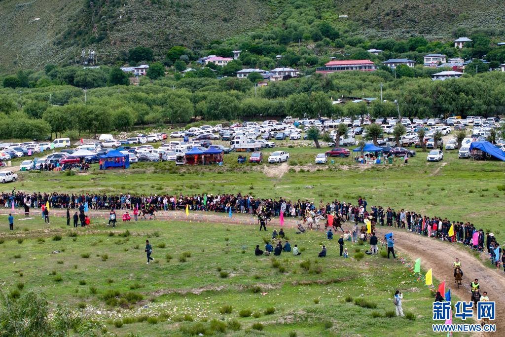 西藏林芝市林芝鎮(zhèn)第七屆尼洋旅游文化之民俗賽馬藝術節(jié)活動現場(7月22日攝,無人機照片)。新華網 旦增努布 攝