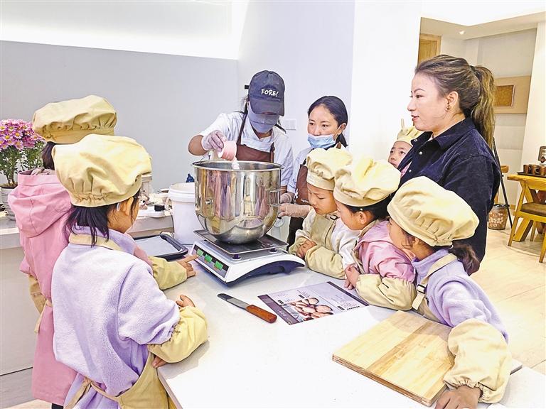 圖為烘培師為小朋友演示糕點制作的方法與步驟。 記者 格桑倫珠 攝