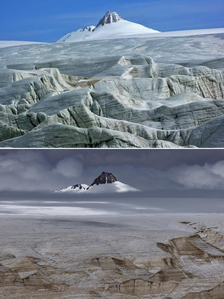 拼版照片:上圖為2009年6月拍攝的普若崗日主峰(新華社發(fā) 車剛攝);下圖為2024年9月4日拍攝的普若崗日主峰(新華社記者姜帆攝)。對(duì)比可以看出普若崗日主峰下的冰原消融嚴(yán)重。新華社發(fā)
