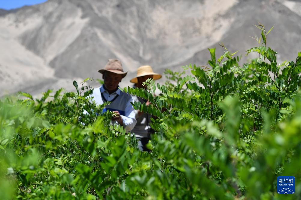 西藏山南市貢嘎縣吉雄鎮(zhèn)劉瓊村村民在查看樹苗生長情況(2021年6月2日攝)。新華社記者 晉美多吉 攝