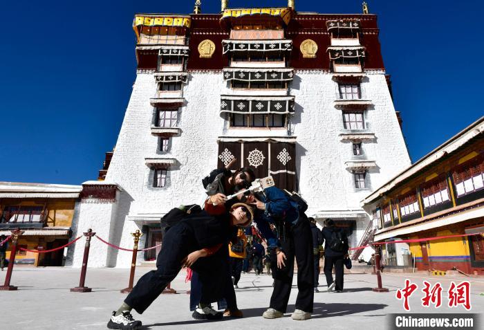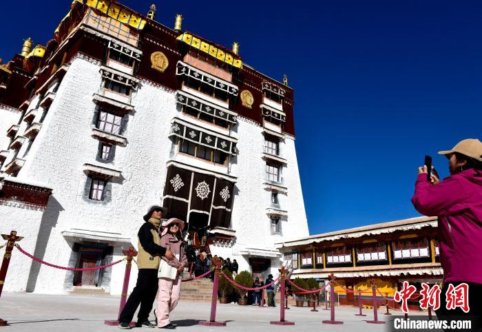 隨著2024冬游西藏的啟動,西藏所有A級景區(qū)(寺廟景區(qū)除外)免費(fèi)游覽,布達(dá)拉宮也成為冬游西藏?zé)衢T游覽地之一。圖為11月1日,來自四川的信眾在布達(dá)拉宮拍照留念。中新社記者 李林 攝
