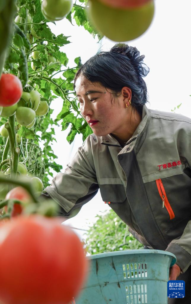 11月22日,在丁青縣農(nóng)業(yè)生態(tài)產(chǎn)業(yè)園,工作人員在采摘西紅柿。新華社記者 格桑朗杰 攝??