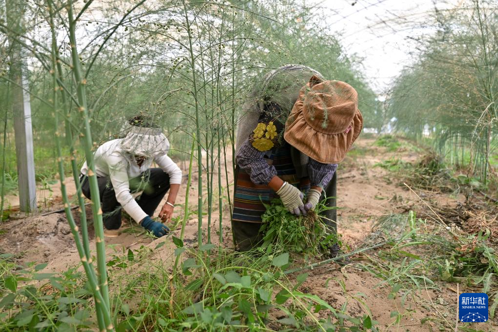 ?7月19日,西藏扎囊縣綠之源現(xiàn)代農(nóng)業(yè)科技股份有限公司的員工在有機(jī)蘆筍大棚內(nèi)手工除草。新華社記者 李鑫 攝 ??