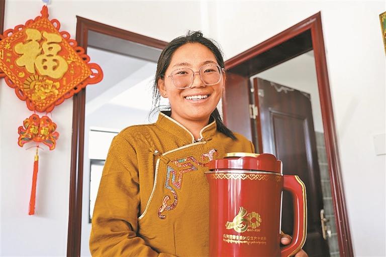 “太幸福啦!家里不僅收獲了青稞,住進(jìn)了新房,還收到了中央代表團(tuán)送來的禮物?!钡┰銎粘嘈Φ孟褚欢涫㈤_的格?;?,“我把新打的酥油茶送過來,和大家一起慶祝豐收,也分享這份幸福?!?/p>