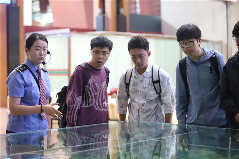 清華學子在車站教育基地文化長廊展柜旁觀看鐵路老物件。圖由 通訊員 武春燕 提供