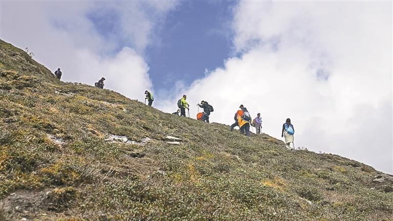 圖為參賽者們正在登山前往古如拉措。記者 武沛濤 攝