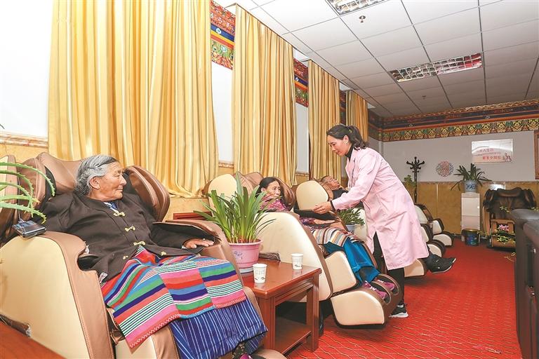 圖為阿里地區(qū)雙集中供養(yǎng)中心里,老人們在保健理療室進行按摩保健。記者 格桑吉美 攝(資料圖片)