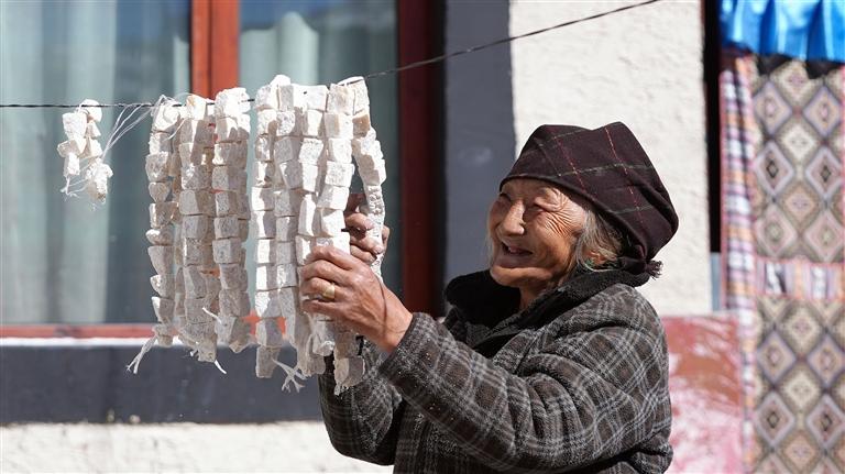 74歲的洛桑塔杰坐在庭院里,正專注地編織牦牛項圈。彩色繩線在他指尖翻飛纏繞,漸漸勾勒出別致紋路。不遠處,他的老伴在晾曬奶渣,潔白的顆粒在陽光下泛著誘人光澤,兩位老人的臉上滿是藏不住的幸福笑意?!凹依?70多頭牲畜由兒女照管,我們閑時就做點手工活解悶?!?洛桑塔杰笑著打開話匣子,“今年多虧村委會發(fā)放了7頭適齡母牦牛,還帶領(lǐng)大家加入村集體牦牛養(yǎng)殖項目。我學會了科學飼養(yǎng)技術(shù),年底能分紅,牛奶、酥油、奶渣自己吃不完還能賣,日子過得充實又紅火!”