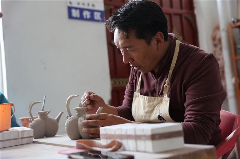 公司實行“按勞計酬”的薪酬制度,為員工提供了穩(wěn)定的收入保障。這份“家門口”的可觀收入,讓員工們穩(wěn)穩(wěn)撐起了家庭的幸福生活?!耙郧霸诩曳N地,收入沒著落,現(xiàn)在在公司做黑陶,不僅學(xué)到了一門手藝,每個月還有固定工資,日子越過越有盼頭了!”作為曲珠的第一批學(xué)生,扎西如今已能獨立設(shè)計制作復(fù)雜的黑陶茶具,月薪穩(wěn)定在5000元,他的感慨道出了所有員工的心聲。這些扎根鄉(xiāng)土的手藝人,不僅用雙手改變了自身生活,更因?qū)@門技藝的熱愛與堅守,成為察雅黑陶傳承路上的重要力量。