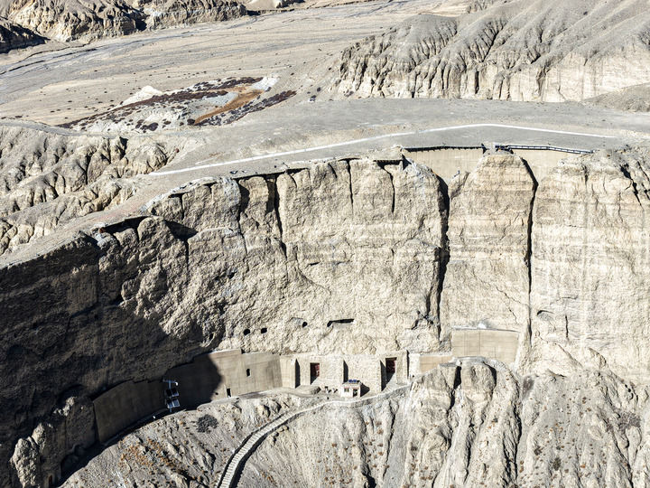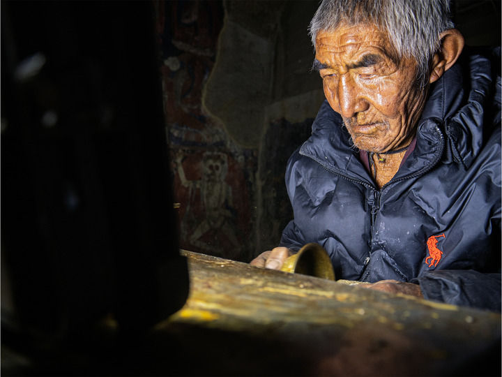 1987年,那時(shí)的東嘎石窟尚無(wú)人問(wèn)津。甚至沒(méi)有像樣的路,阿旺米朗硬生生在陡峭的山體上走出了一條路。那會(huì)兒,石窟還有些滲水,他獨(dú)自一人扛著塑料布從山的另一邊繞上陡峭的山頂,在海拔4000多米的山頂為洞窟做防水措施;高原漫長(zhǎng)的寒冬里,他能依靠的熱源只有手中的酥油燈——但沒(méi)過(guò)多久,他就發(fā)現(xiàn)酥油燈會(huì)熏黑墻壁,他便自己在石窟外搭了個(gè)簡(jiǎn)單的房屋。