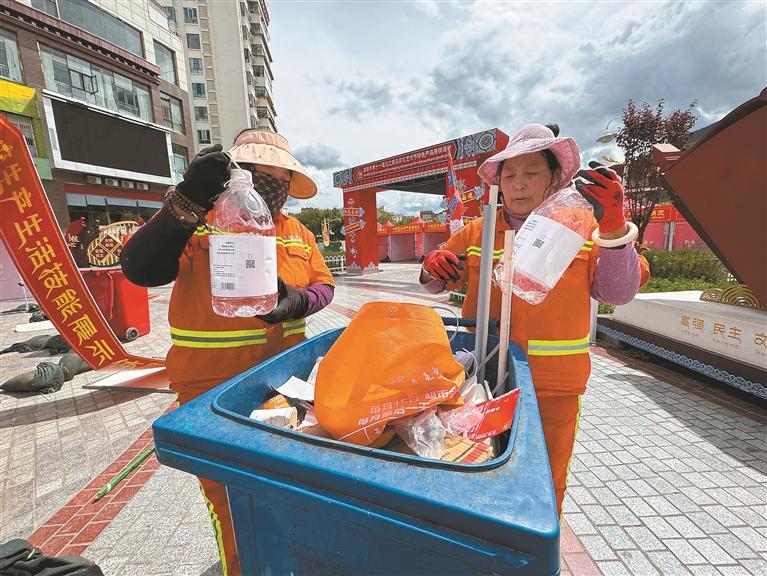 圖為昌都市的環(huán)衛(wèi)工人在進行垃圾分類。記者 白瑪澤旺 攝