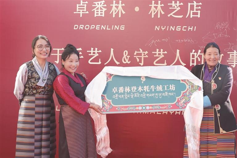 圖為卓番林主理人卓瑪(左一)為工坊授牌。圖由西藏卓番林文化有限公司提供