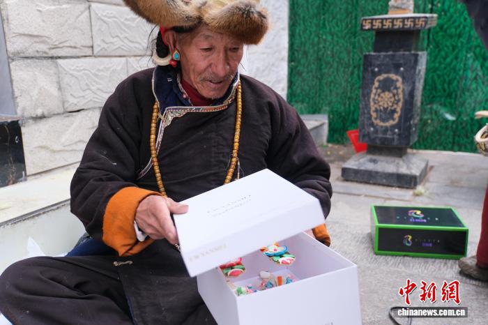 2月13日,拉薩年貨市場(chǎng),來自日喀則市仁布縣的酥油花手工藝人加布正在打包剛賣出去的酥油花。中新社記者 江飛波 攝