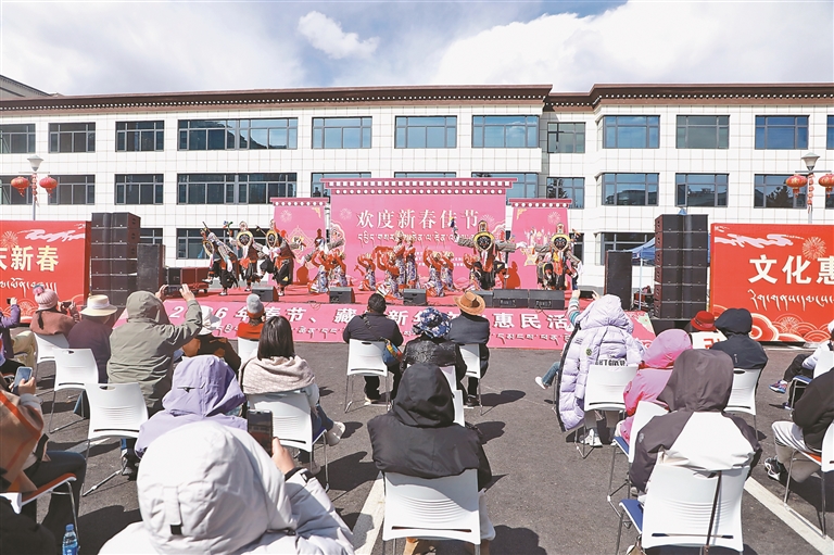隨后,在社區(qū)劇場(chǎng)內(nèi),雅礱扎西雪巴藏戲精彩上演。演員們頭戴面具、身著華麗戲服,以高亢嘹亮的唱腔和富有張力的動(dòng)作,演繹著古老傳說(shuō)。舞臺(tái)下,游客們或舉起手機(jī)記錄精彩瞬間,或隨著節(jié)奏輕輕拍手,沉浸在這場(chǎng)獨(dú)具藏式風(fēng)情的“村晚”之中,劇場(chǎng)里洋溢著歡樂(lè)祥和的節(jié)日氛圍。