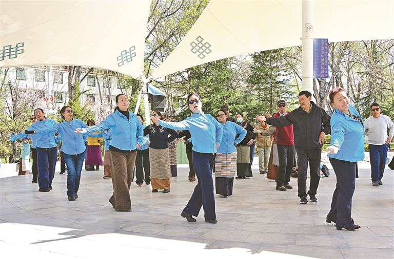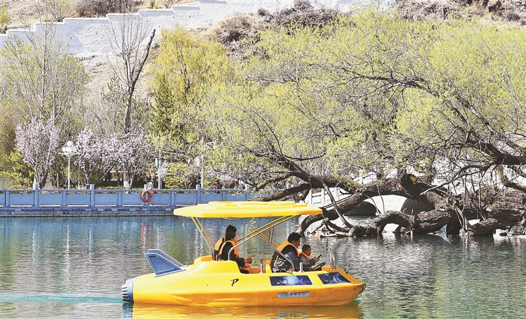 宗角祿康公園內(nèi),春日風光靈動又愜意。湖面碧波蕩漾,嫩綠垂柳輕拂水面,一艘艘游船悠然穿行于碧波之上,船上游客歡聲笑語不斷。岸邊廣場上,歡快的音樂此起彼伏,不少市民伴著節(jié)拍跳起健身操,舞步輕盈、神采飛揚,悠然閑適的靜態(tài)美景與熱情洋溢的動態(tài)活力相互交融,盡顯高原春日別樣風情。