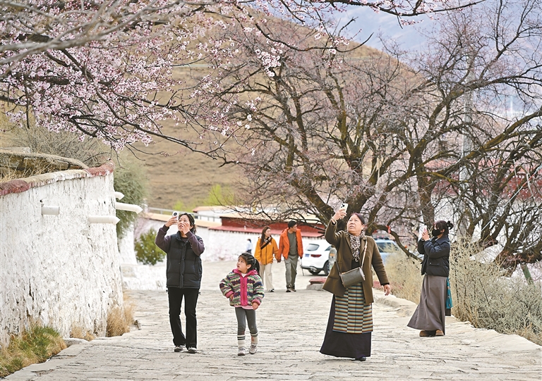 春日的帕邦喀,桃花競相綻放,灼灼芳華鋪滿山間。粉白相間的花海層層疊疊,將古樸建筑掩映其中,勾勒出別樣的詩意畫面。游人漫步花海小徑,或駐足賞花,或拿起相機定格美景,歡快的笑聲與清幽的花香相互交織,奏響了高原春日里的動人樂章。