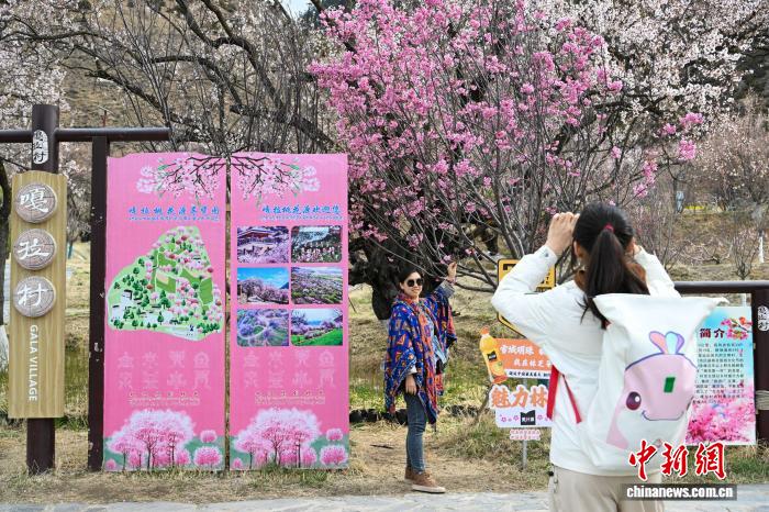 4月3日,游客在嘎拉村拍照留念。西藏林芝市嘎拉村被譽為“林芝桃花第一村”,是林芝市最佳的賞花地之一。中新社記者 貢嘎來松 攝