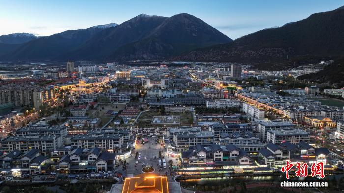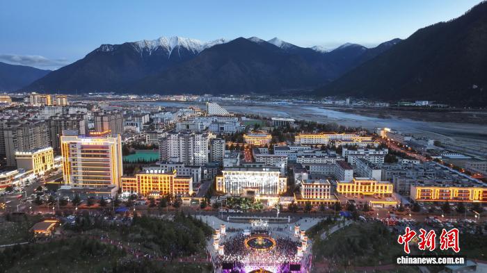 4月3日晚,西藏林芝市城市夜景美,城市建筑、街道的燈光與雪山相映成趣,景色美麗。(無人機(jī)照片)中新社記者 貢嘎來松 攝