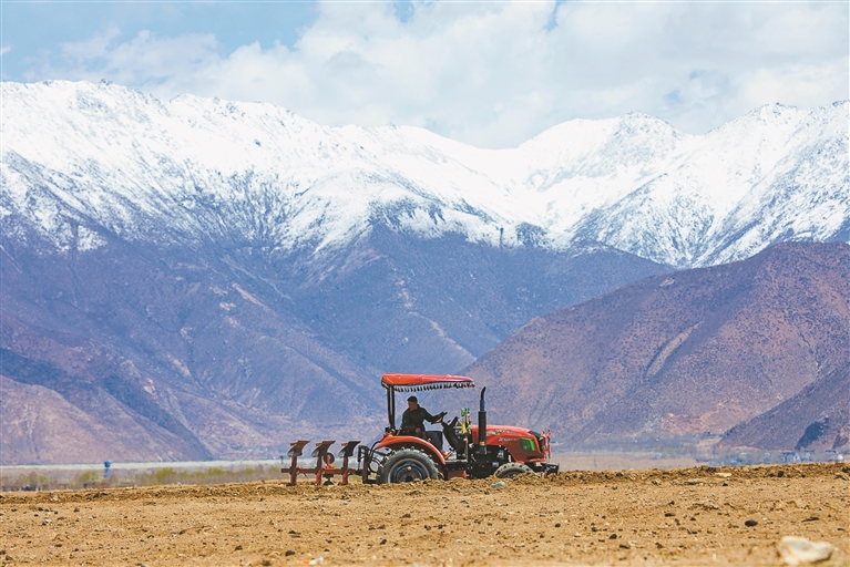 在拉薩市墨竹工卡縣唐加鄉(xiāng)拉東村,大型農(nóng)機來回穿梭在田野間翻耕新土。記者 王敏 通訊員 洛克 攝
