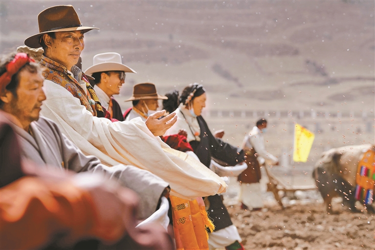 在那曲市索縣首屆高原春耕春播啟動儀式上,身著盛裝的農(nóng)牧民群眾共同播撒希望的種子。記者 汪純 通訊員 索朗白姆 攝