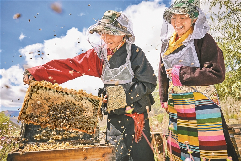 去年,結(jié)巴鄉(xiāng)蜜蜂養(yǎng)殖產(chǎn)業(yè)通過(guò)西藏夜伴蜂聲文化旅游發(fā)展有限公司向山南市、日喀則市、拉薩市等地的11個(gè)縣、超過(guò)50個(gè)行政村進(jìn)行分紅,惠及農(nóng)牧民9000余戶(hù)、3.1萬(wàn)余人,分紅總額達(dá)406.22萬(wàn)元。