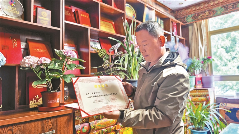 圖為李喜軍展示他獲得的榮譽(yù)證書。記者 旦增嘎瓦 攝