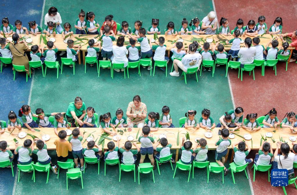 6月19日,貴州省遵義市余慶縣羽翅幼兒園的孩子們在學(xué)習包粽子。新華社發(fā)(王永娟 攝)