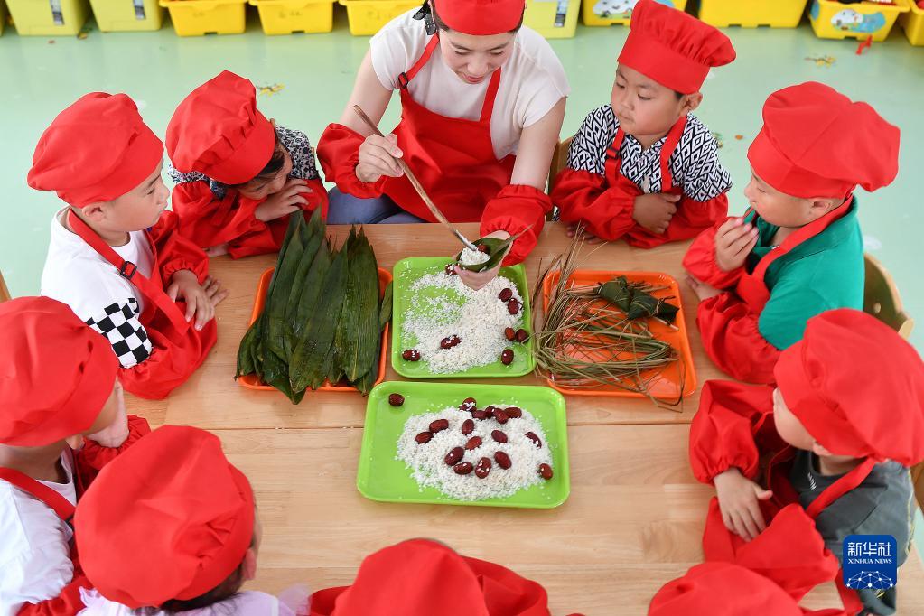 6月19日,山東省煙臺市福山區(qū)清洋街道中心幼兒園的小朋友在老師指導(dǎo)下學(xué)習包粽子。新華社發(fā)(孫文潭 攝)
