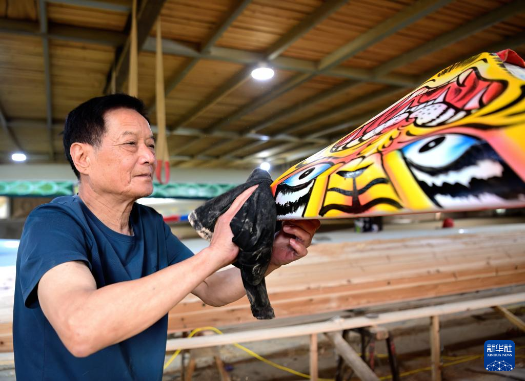 6月3日,福州市非物質文化遺產(chǎn)“方莊龍舟制造技藝(閩侯縣)”的傳承人方紹晃在擦拭準備交付的龍舟船頭。新華社記者魏培全攝