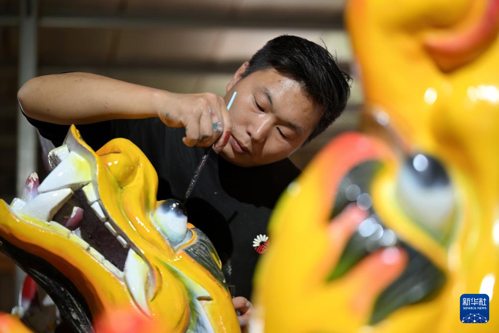 6月3日,工人在給一顆新龍頭上色。龍舟龍頭的制作最為復雜,需用幾十把不同的修光刀進行加工,再進行切割、噴漆、上色等步驟。新華社記者魏培全攝