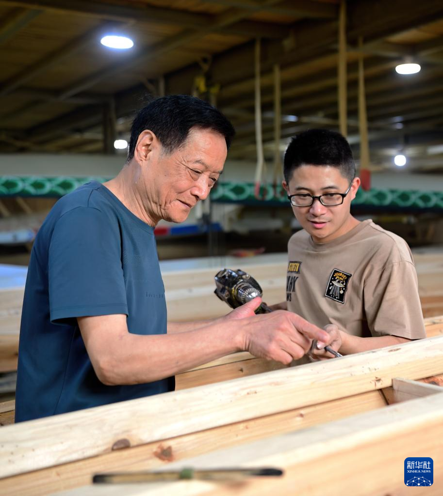6月3日,福州市非物質文化遺產(chǎn)“方莊龍舟制造技藝(閩侯縣)”的傳承人方紹晃(左)在給侄兒方劍偉(右)傳授福州傳統(tǒng)龍舟制作技藝。方劍偉現(xiàn)在是“方莊龍舟制造技藝(閩侯縣)”第四代傳承人。新華社記者魏培全攝