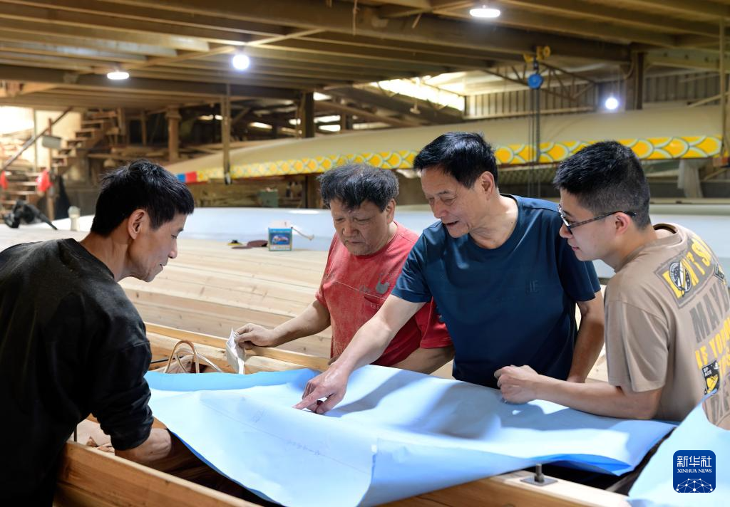 6月3日,福州市非物質文化遺產(chǎn)“方莊龍舟制造技藝(閩侯縣)”的傳承人方紹晃(右二)與家人們一起探討龍舟的制作工藝。新華社記者魏培全攝