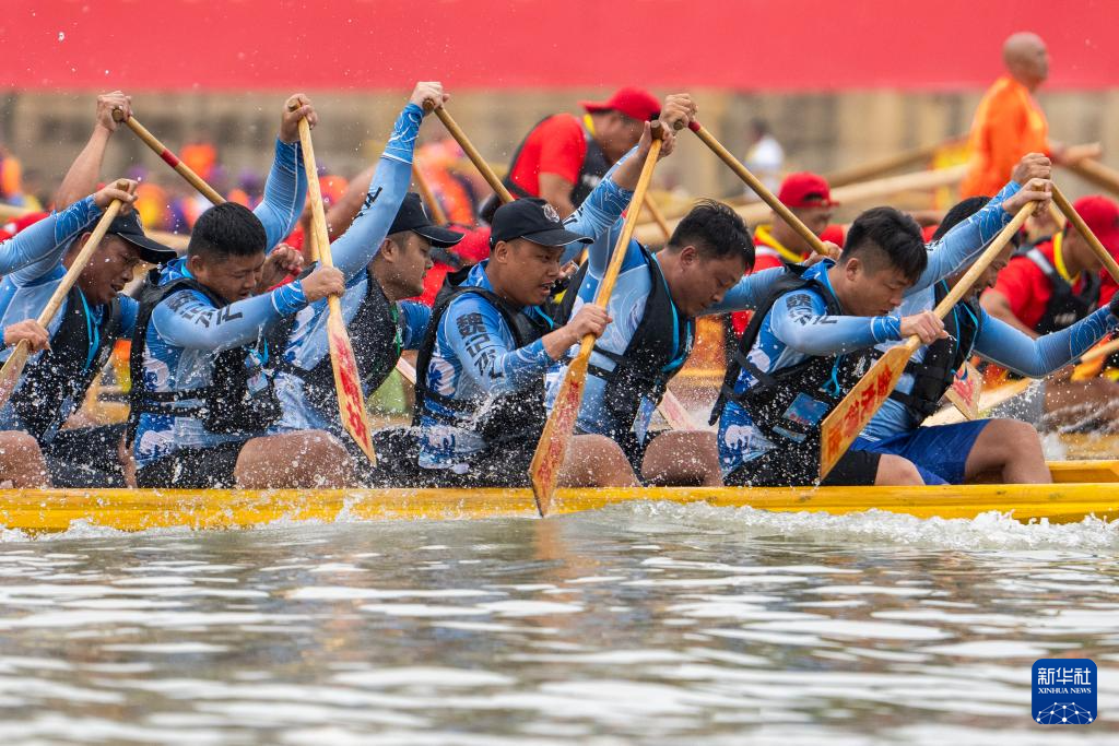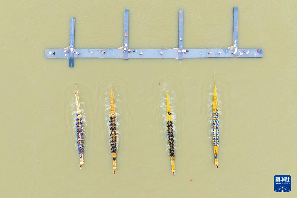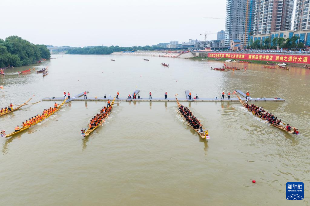 當(dāng)日,“國家非遺道州龍船傳統(tǒng)賽”在湖南永州道縣瀟水河水域開賽,吸引了當(dāng)?shù)亟?00支龍舟隊(duì)5000余人同臺(tái)競技,奮楫競渡,迎接端午節(jié)的到來。