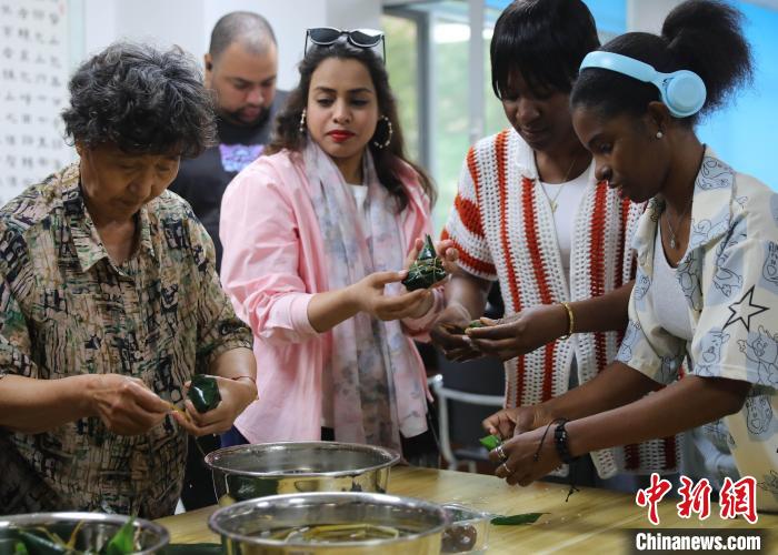 5月27日,在河北省秦皇島市海港區(qū)白塔嶺街道燕大西苑社區(qū),當(dāng)?shù)赝鈬?guó)留學(xué)生相聚一堂,通過包粽子、體驗(yàn)?zāi)景婺戤嫷确绞剑两襟w驗(yàn)中華文化的魅力。