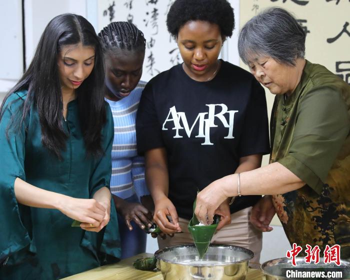 圖為社區(qū)居民指導(dǎo)外國(guó)留學(xué)生包粽子。曹建雄 攝