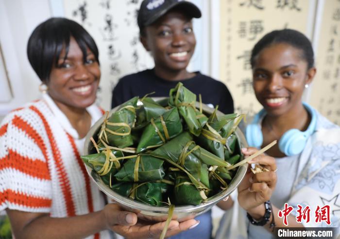 圖為外國(guó)留學(xué)生展示包好的粽子。曹建雄 攝