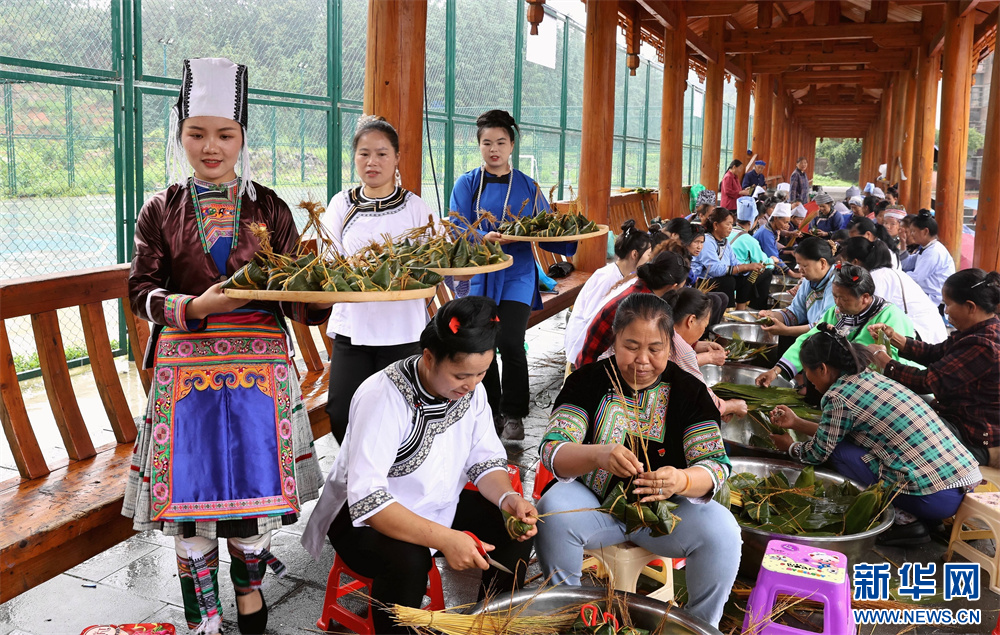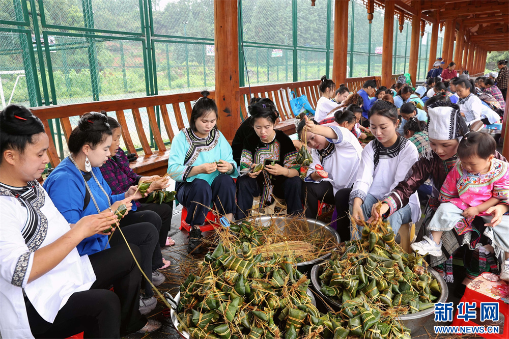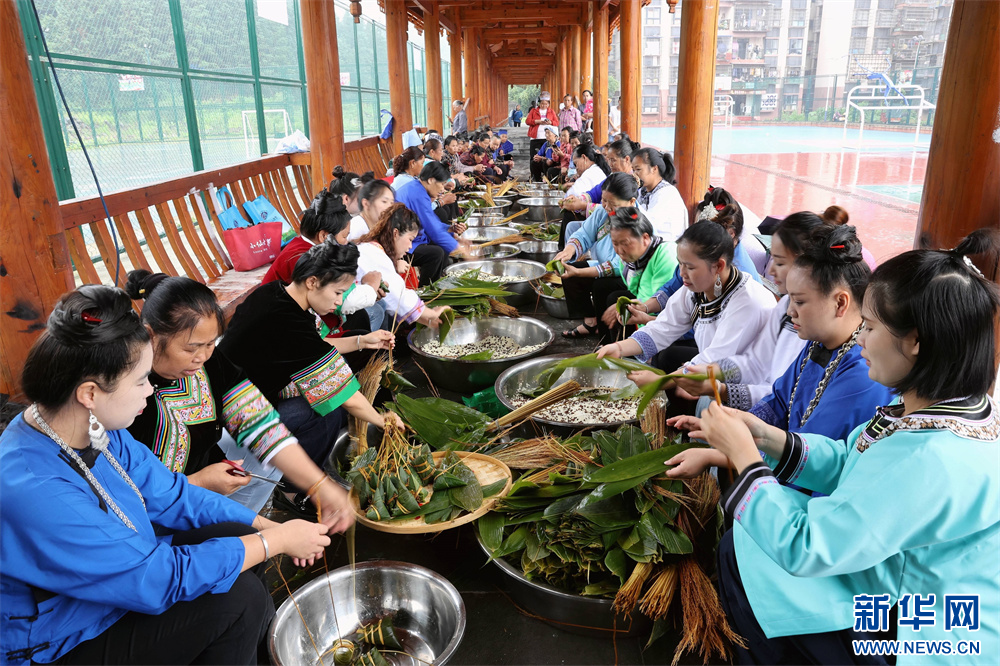5月28日,市民在貴州省黔東南苗族侗族自治州榕江縣車民街道陽(yáng)光社區(qū)包粽子。新華網(wǎng)發(fā)(李長(zhǎng)華 攝)